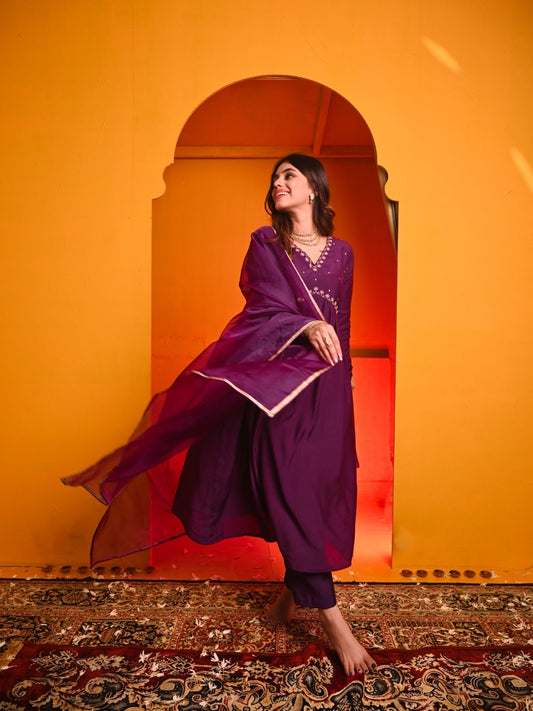Kusum Purple Embroidered Muslin Suit Set