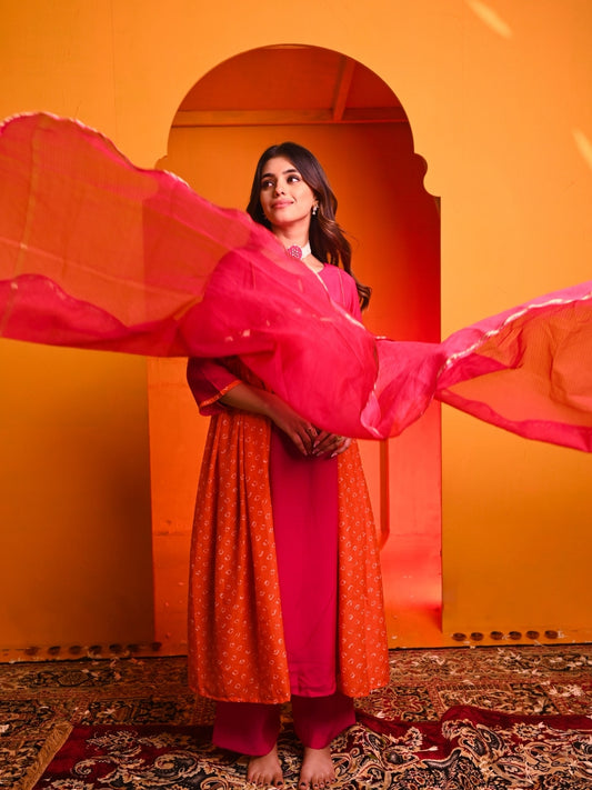 Gulshan Pink Orange Bandhani Muslin Suit Set with Kota Doria Dupatta