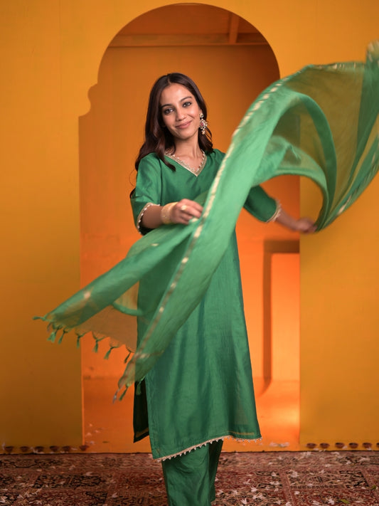 Roza Green Chanderi Suit Set with Kota Doria Dupatta