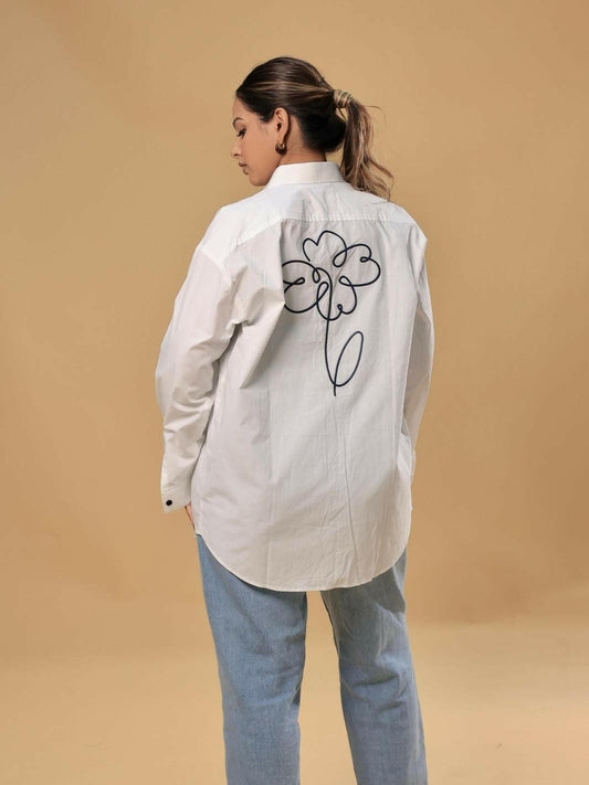 I absolutely love this top! The white fabric with delicate blue tree embroidery gives it a fresh, elegant look, perfect for casual outings. The tie-front detail and collar add a charming touch, while the lightweight material makes it super comfortable to wear. It pairs beautifully with any jeans.