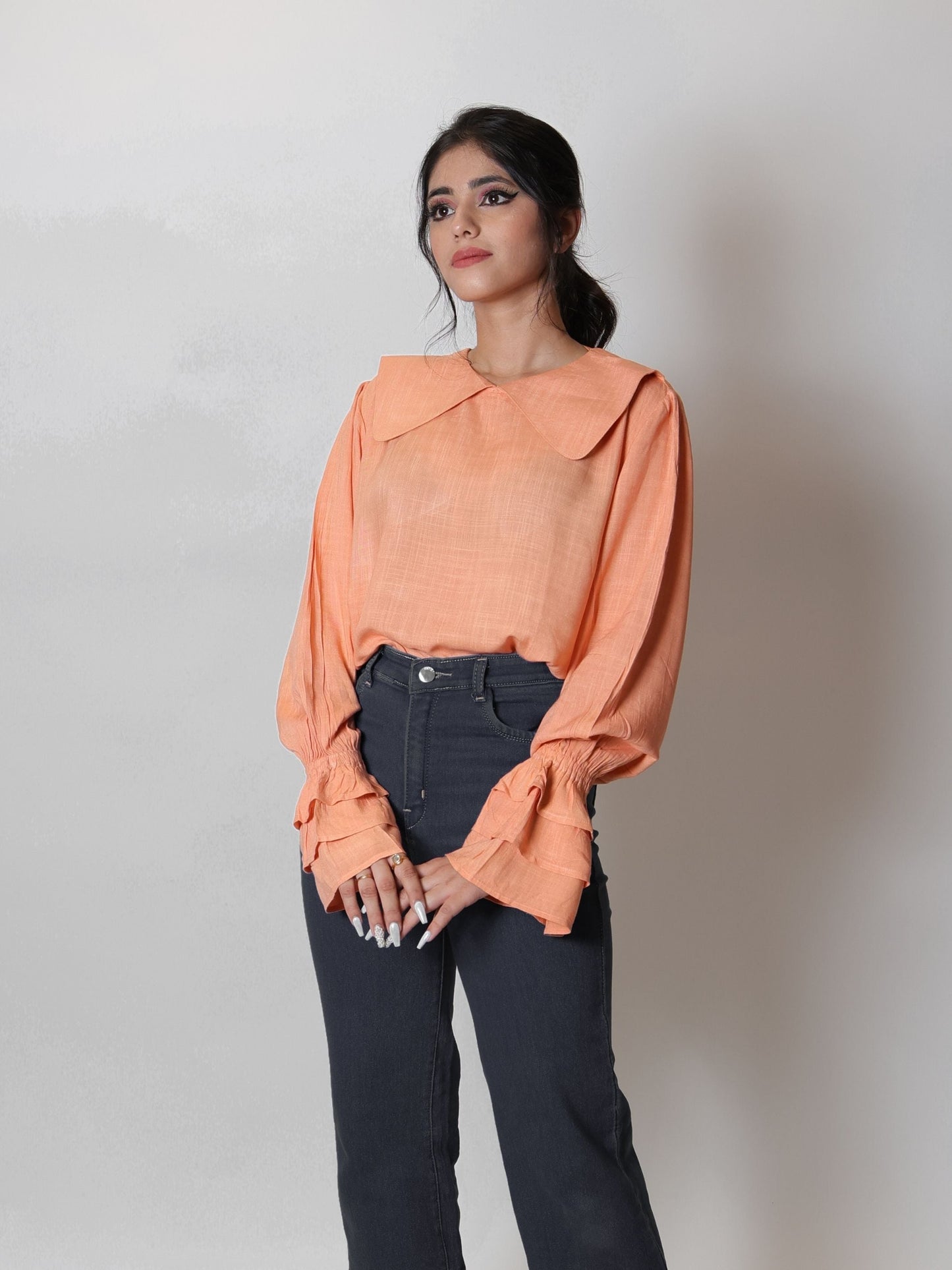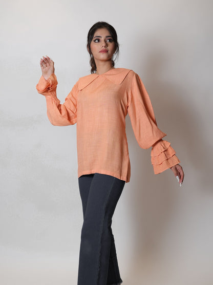 This coral peach long top is made of a premium quality rayon fabric that offers a soft and comfortable feel. A peter pan collar adds a traditional touch, while layered sleeves provide extra style. The relaxed fit is comfortable to wear over or under other layers of clothing, making it a great option year round.