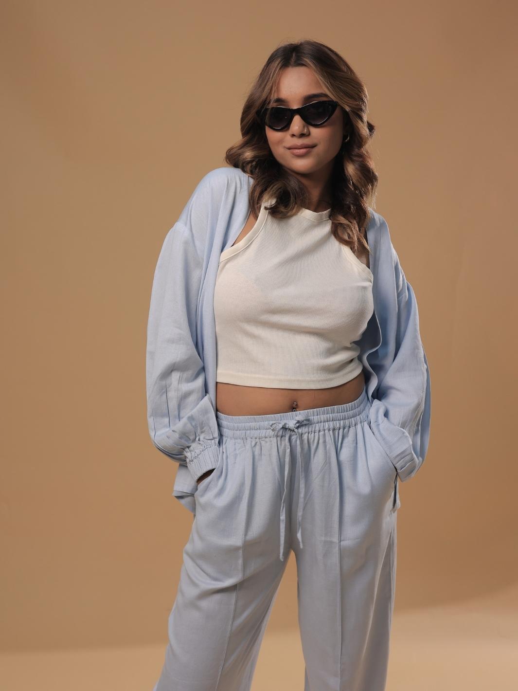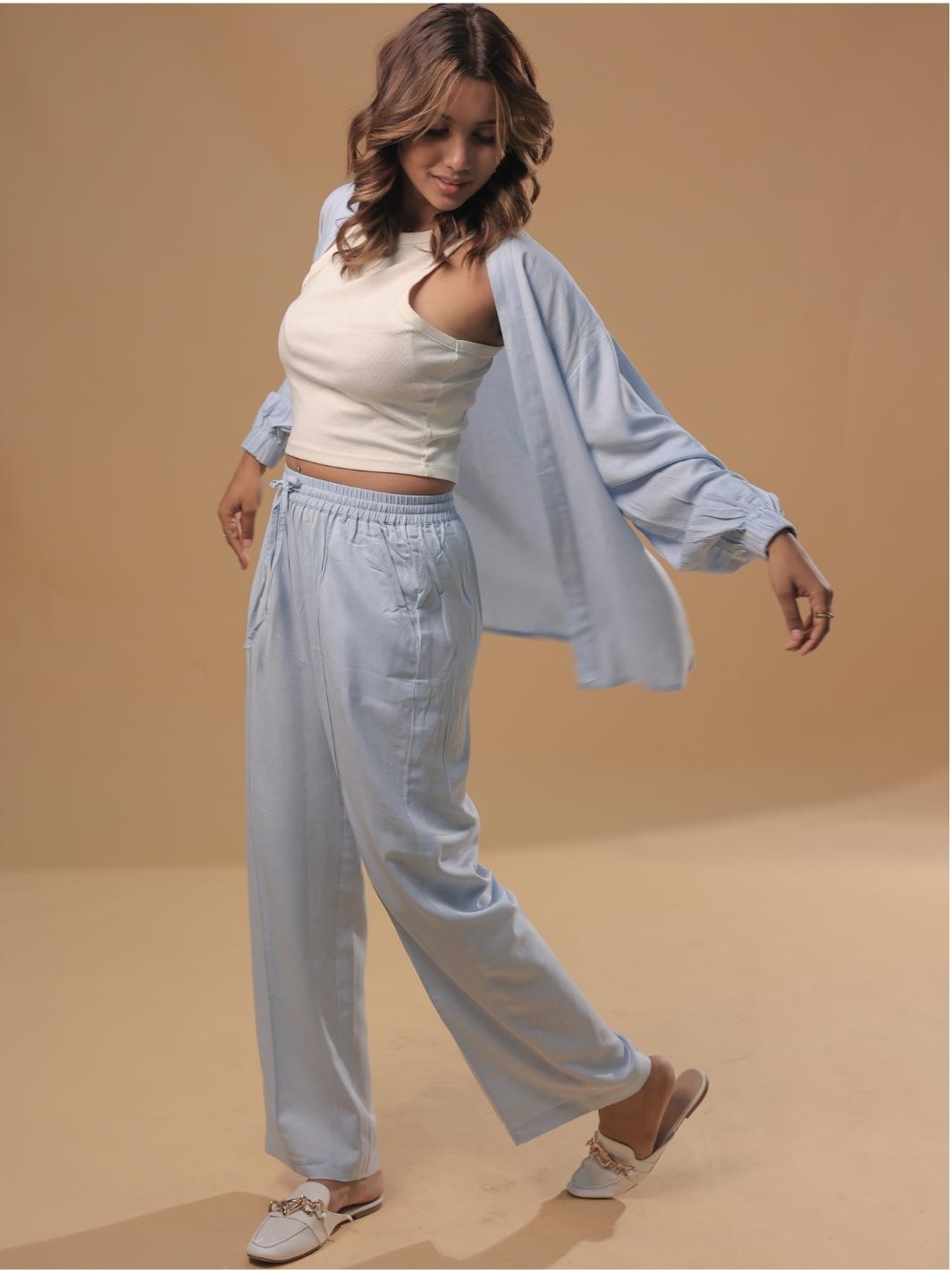 This Sky Blue Shrug Pant will add a modern, feminine touch to your outfit. The soft, light and flowy fabric makes it perfect for everyday wear and the versatile design allows you to pair it with anything from tops and minis to tucked shirts and blazers.