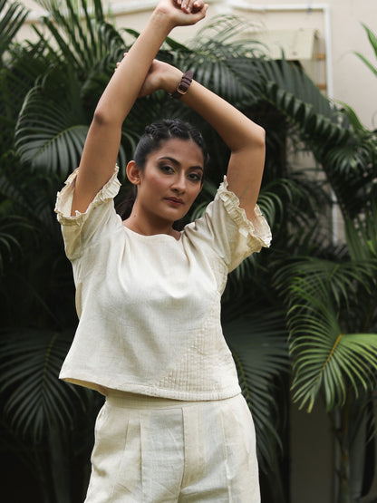 Co-ordinates are perfect for any casual occasion which it is what makes them so versatile. The top has a relaxed fit, accordion pleats on the top with a ruffle sleeve. The pants are relaxed & flowy with an elastic waist band and 2 front pockets. Paired best with kicks or sneakers.