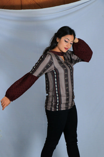 “The Maroon balloon” Grey top featuring digital printed pashmina twill with maroon balloon chikan sleeves . The neckline is a comfortable boat neck , easily wearable.
