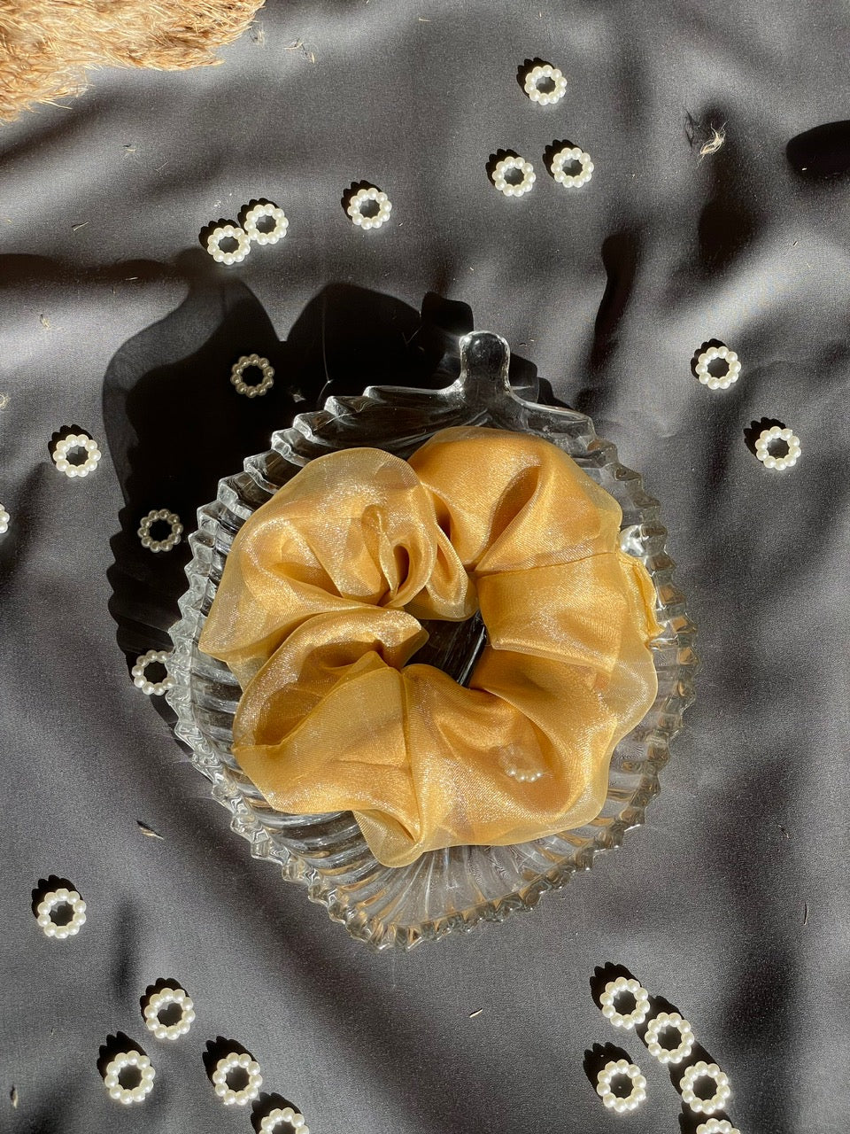 Light on Scrunchies consisting of extra large double layer scrunchie with beads to give that festive touch. it has a layer of satin and net. It consist of 3 variants red, beige, golden.