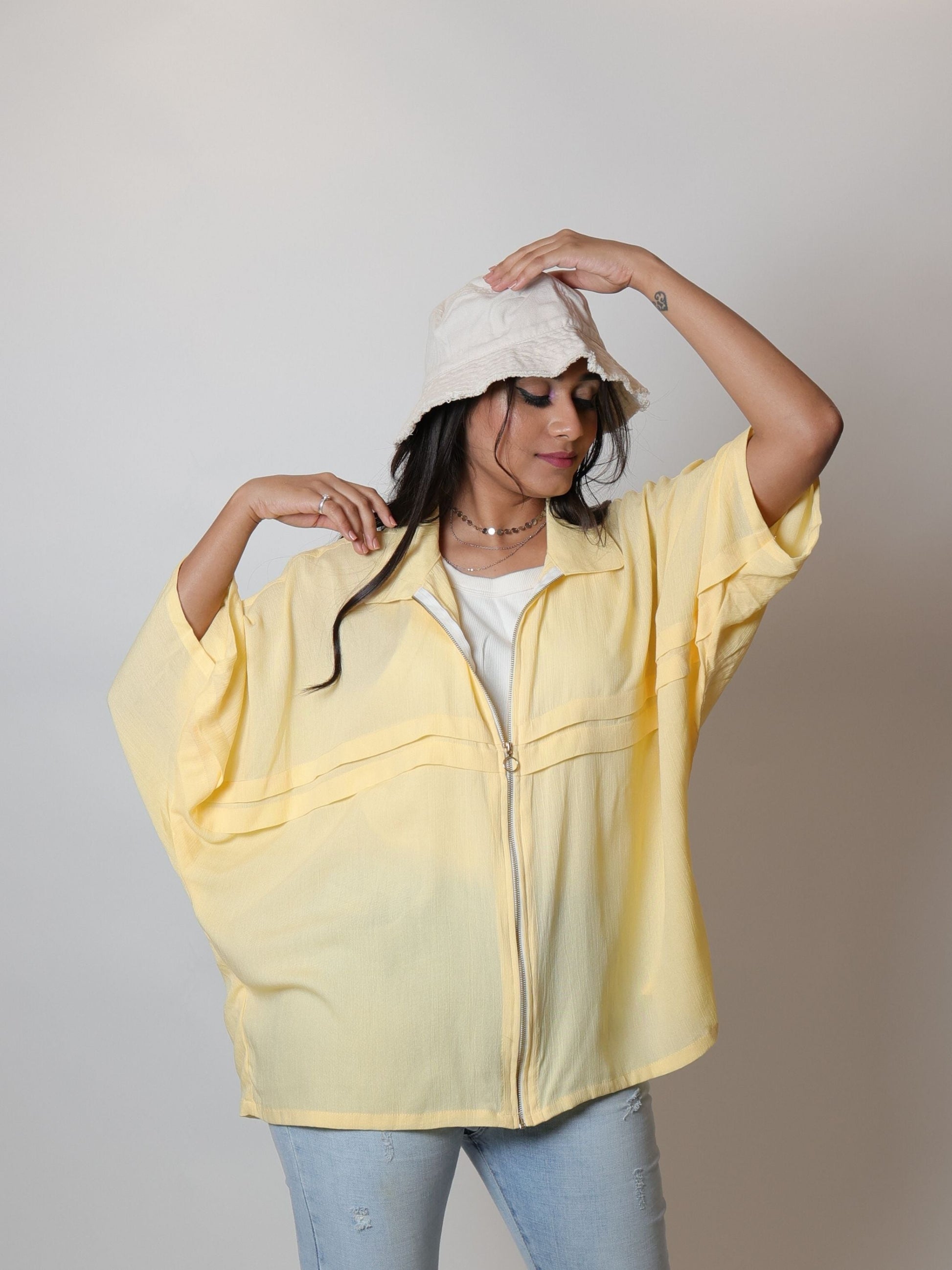 Our Sunny Yellow Zipper Shirt is cheeky, fun and fashion forward. It has an oversized fit with a front zip closure and gold colored zip, as well as a drop shoulder 3/4 sleeves. The little Pleat details makes it stand out. The rayon fabric does not crease easily and can be dressed up or down for a variety of occasions.