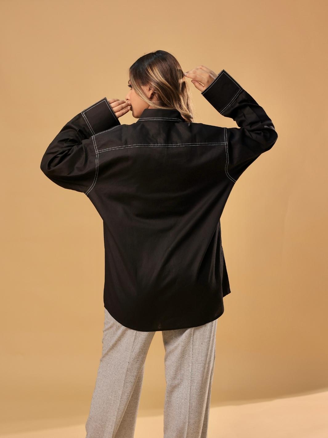 The black shirt is more than just a basic piece. The subtle stitch lines adds a touch of sophistication and depth to the design. The shirt's versatility shines through, making it suitable for both casual gatherings and semi-formal occasions. Crafted from high-quality materials, it boasts a soft texture against your skin, ensuring all-day comfort without compromising on style.